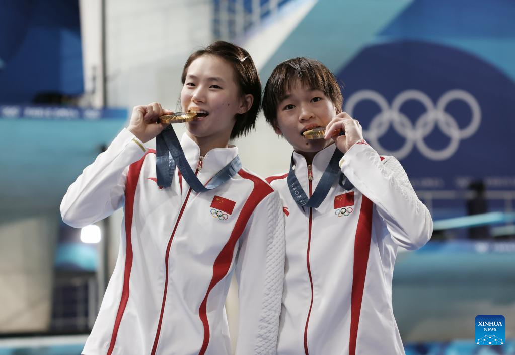 Gold medalists Chen Yuxi/Quan Hongchan (R) of China pose for photos during the awarding ceremony after the women's synchronised 10m platform final of diving at the Paris 2024 Olympic Games in Saint Denis, near Paris, France, on July 31, 2024. (Xinhua/Zhang Yuwei)