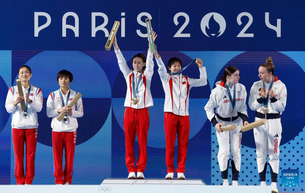 Gold medalists Chen Yuxi/Quan Hongchan of China, silver medalists Jo Jin Mi/Kim Mi Rae of the Democratic People's Republic of Korea and bronze medalists Andrea Spendolini Sirieix/Lois Toulson of Great Britain attend the awarding ceremony after the women's synchronised 10m platform final of diving at the Paris 2024 Olympic Games in Saint Denis, near Paris, France, on July 31, 2024. (Xinhua/Zhang Yuwei)