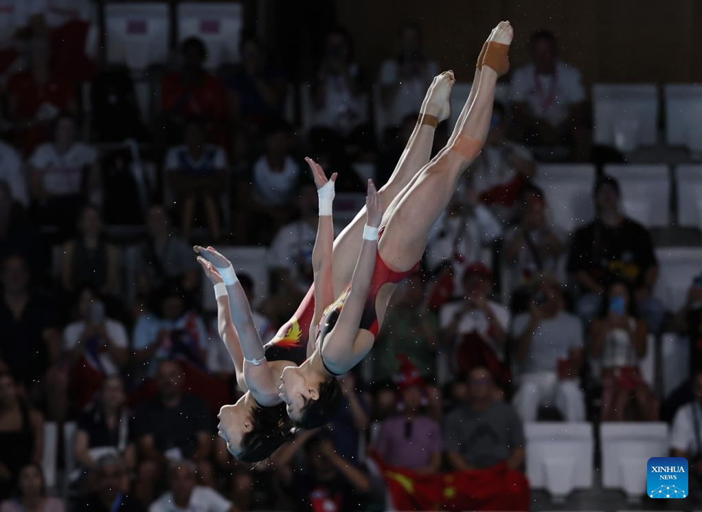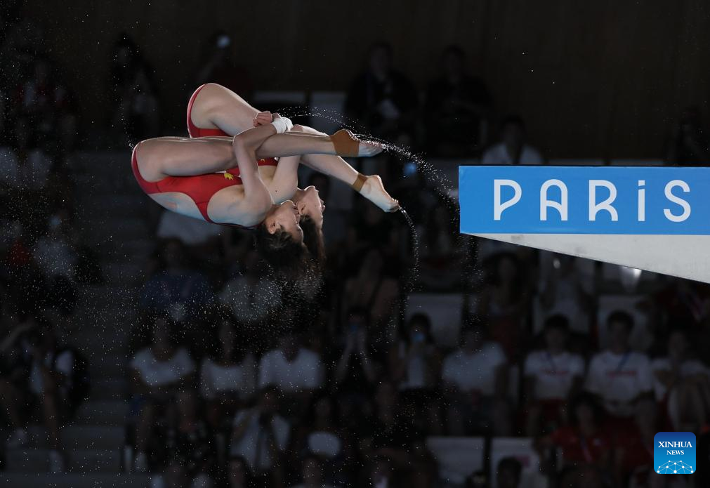 Chen Yuxi/Quan Hongchan (front) of China compete during the women's synchronised 10m platform final of diving at the Paris 2024 Olympic Games in Saint Denis, near Paris, France, on July 31, 2024. (Xinhua/Li Ying)