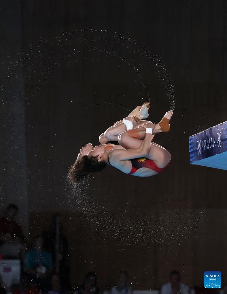 Chen Yuxi/Quan Hongchan (R) of China compete during the women's synchronised 10m platform final of diving at the Paris 2024 Olympic Games in Saint Denis, near Paris, France, on July 31, 2024. (Xinhua/Li Ying)
