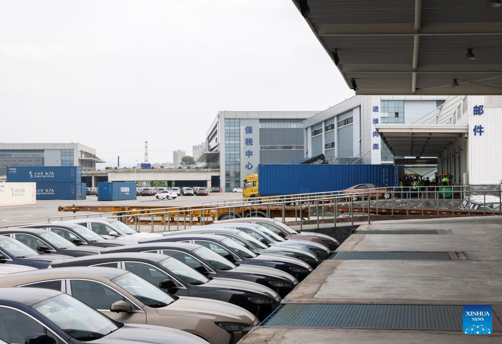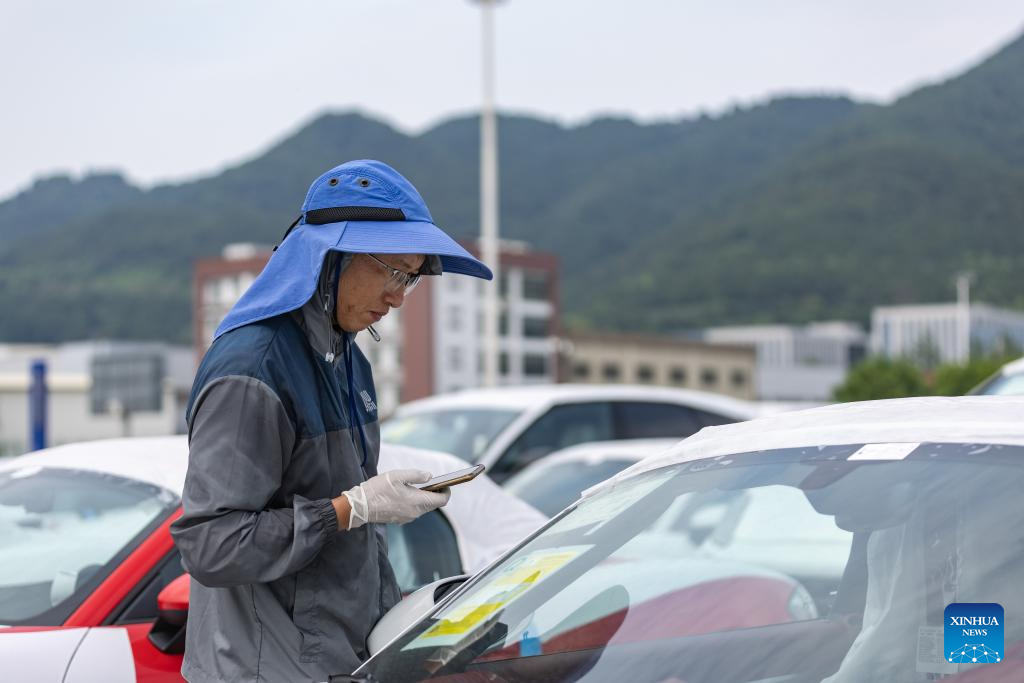 A staff member checks imported vehicles at the Chongqing Railway Port of Chongqing International Logistics Hub Park in Shapingba District of Chongqing, southwest China, July 30, 2024.
