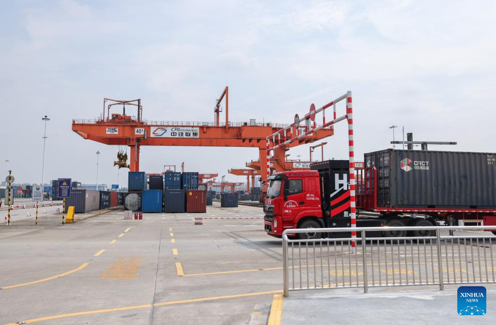 A vehicle transfers a container at the dry port of the New International Land-Sea Trade Corridor in the Chongqing International Logistics Hub Park in Shapingba District of Chongqing, southwest China, July 30, 2024.
