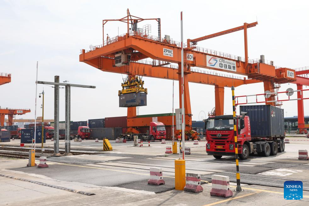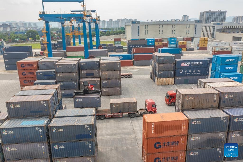 An aerial drone photo taken on July 30, 2024 shows vehicles transferring containers at the Tuanjiecun Station of Chongqing International Logistics Hub Park in Shapingba District of Chongqing, southwest China.