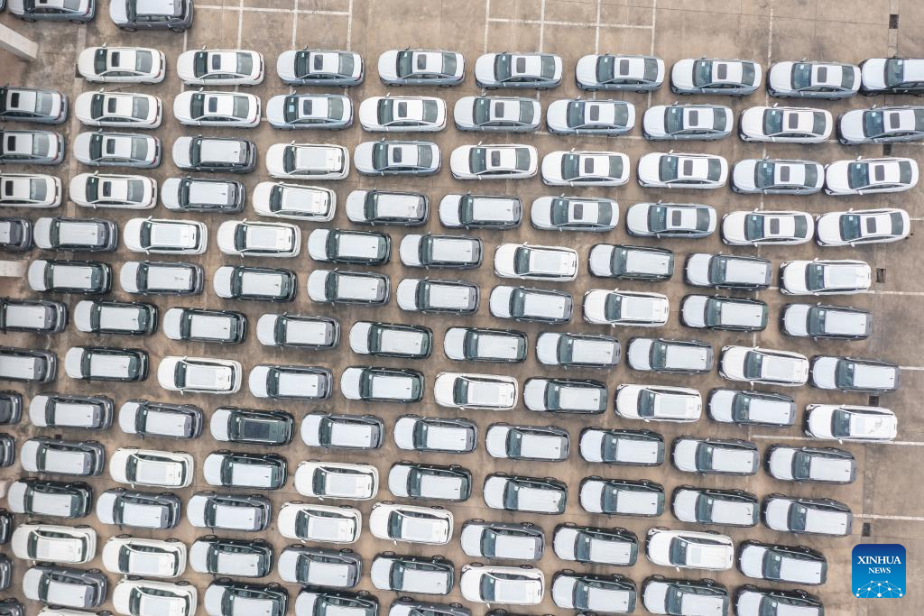 An aerial drone photo taken on July 30, 2024 shows vehicles to be exported at the Chongqing Railway Port of Chongqing International Logistics Hub Park in Shapingba District of Chongqing, southwest China.