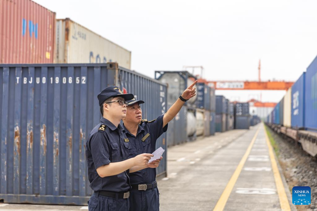 Customs staff inspect a China-Europe freight train at the Chongqing International Logistics Hub Park in Shapingba District of Chongqing, southwest China, July 30, 2024.