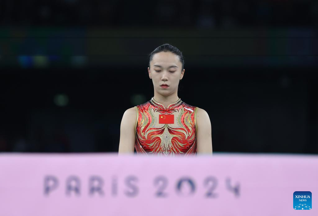 Zhu Xueying of China is seen before the women's qualification of trampoline gymnastics at the Paris 2024 Olympic Games in Paris, France, Aug. 2, 2024. (Xinhua/Cao Can)