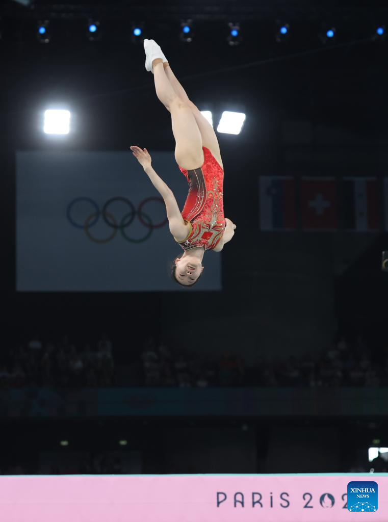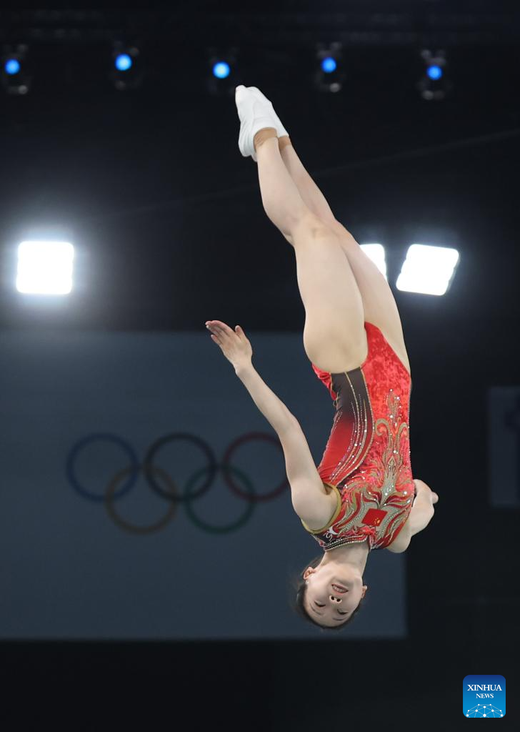 Zhu Xueying of China competes during the women's qualification of trampoline gymnastics at the Paris 2024 Olympic Games in Paris, France, Aug. 2, 2024. (Xinhua/Cheng Min)