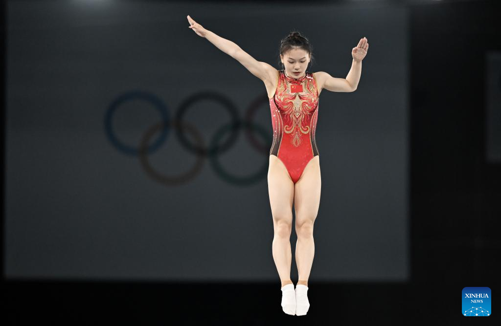 Hu Yicheng of China competes during the women's qualification of trampoline gymnastics at the Paris 2024 Olympic Games in Paris, France, Aug. 2, 2024. (Xinhua/Cheng Min)
