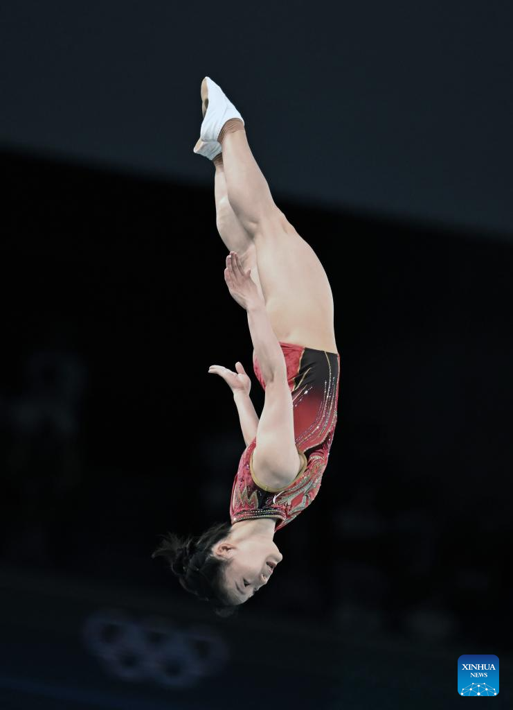 Hu Yicheng of China competes during the women's qualification of trampoline gymnastics at the Paris 2024 Olympic Games in Paris, France, Aug. 2, 2024. (Xinhua/Cao Can)