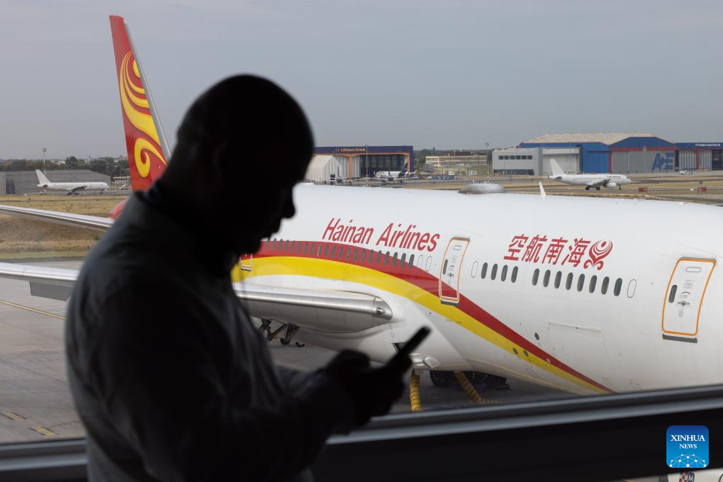 A passenger plane arrives at the Budapest Ferenc Liszt International Airport in Budapest, Hungary, Aug. 2, 2024. A passenger plane taking off from Shenzhen in southern China landed at the Budapest Ferenc Liszt International Airport on Friday, marking the inaugural flight of Hainan Airlines' new direct route between Shenzhen and Budapest. The Budapest-Shenzhen route will operate two flights per week, on Mondays and Fridays. (Photo by Attila Volgyi/Xinhua)