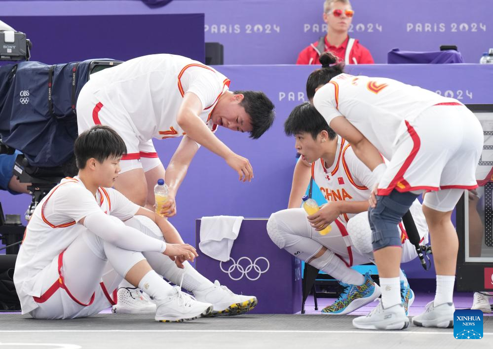 Players of China talk during the 3x3 basketball women's pool round game between China and Germany at the Paris 2024 Olympic Games in Paris, France, on Aug. 2, 2024. (Xinhua/Meng Yongmin)