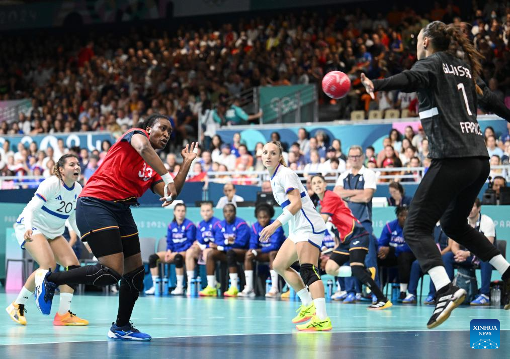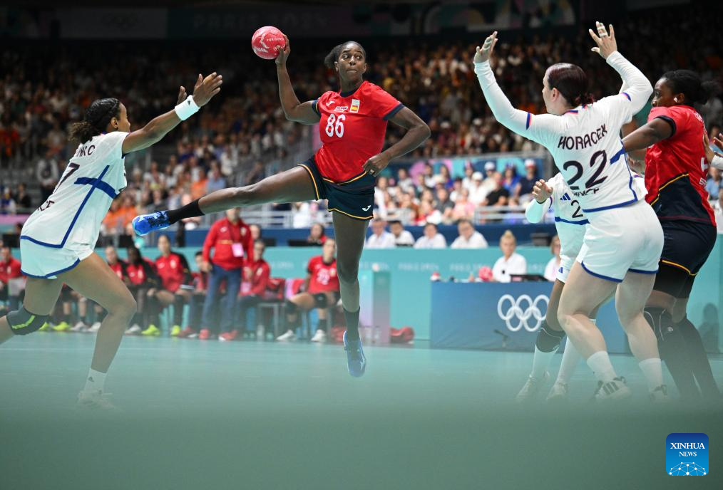 Alexandrina Cabral (2nd L) of Spain competes during the women's preliminary round group B match of handball between Spain and France at the Paris 2024 Olympic Games in Paris, France, Aug. 3, 2024. (Xinhua/He Canling)