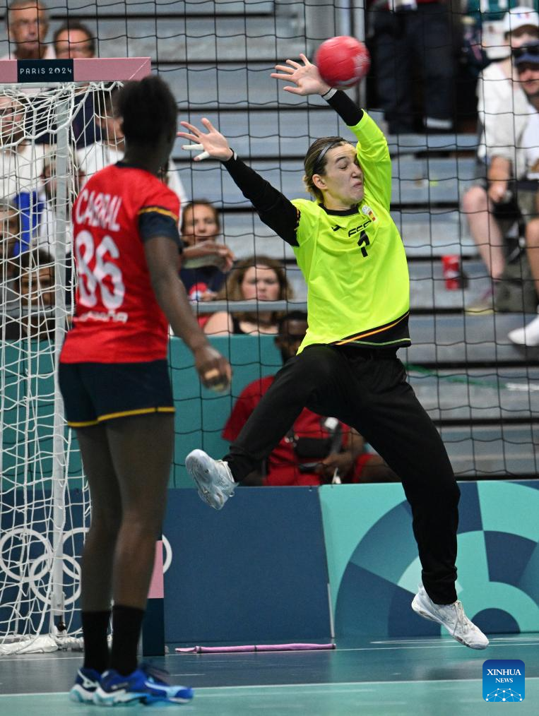 Goalkeeper Nicole Wiggins (R) of Spain competes during the women's preliminary round group B match of handball between Spain and France at the Paris 2024 Olympic Games in Paris, France, Aug. 3, 2024. (Xinhua/He Canling)