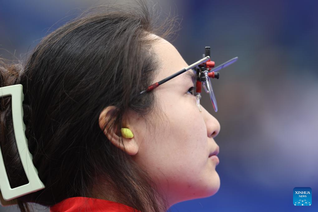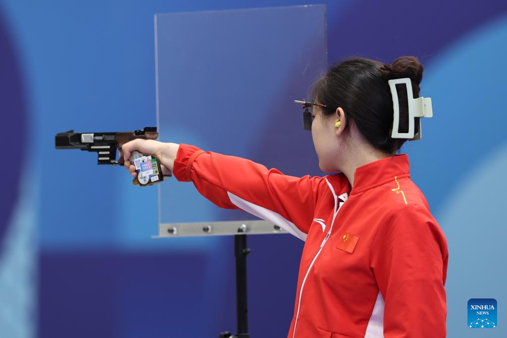 Zhao Nan of China competes during the 25m pistol women's final of shooting at the Paris 2024 Olympic Games in Chateauroux, France, Aug. 3, 2024. (Xinhua/Zhang Fan)