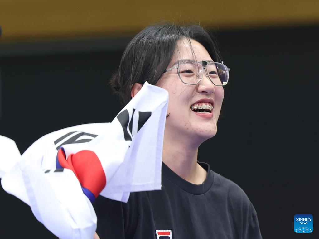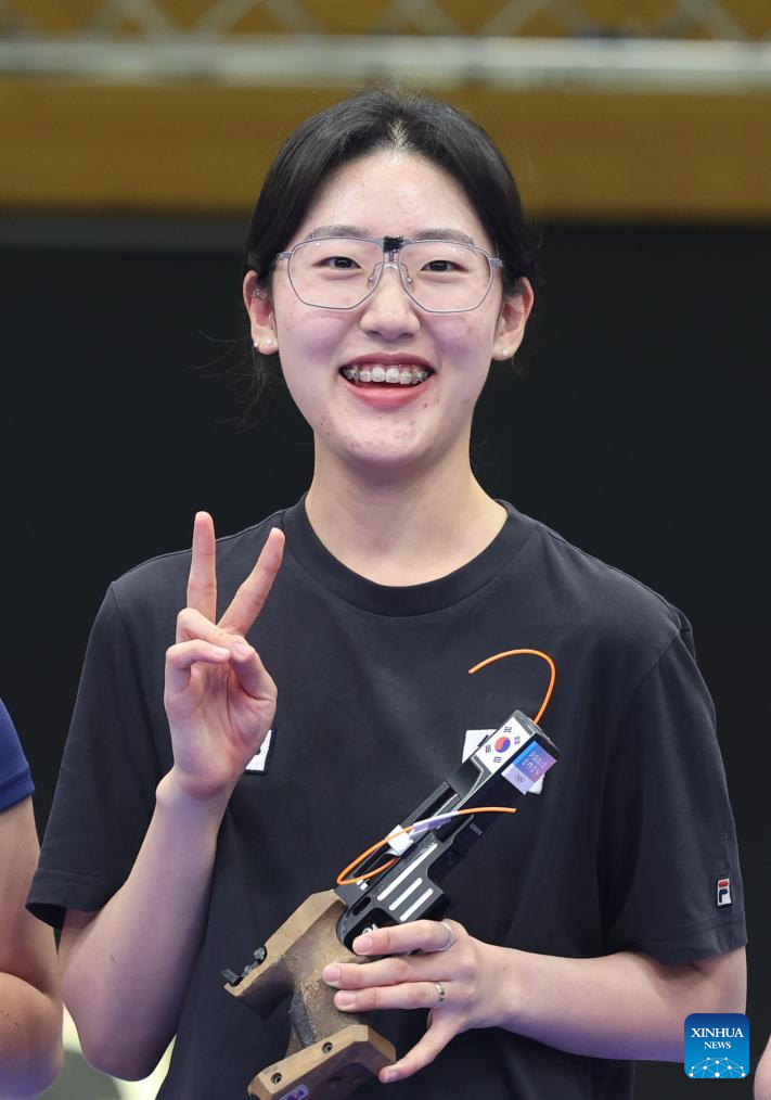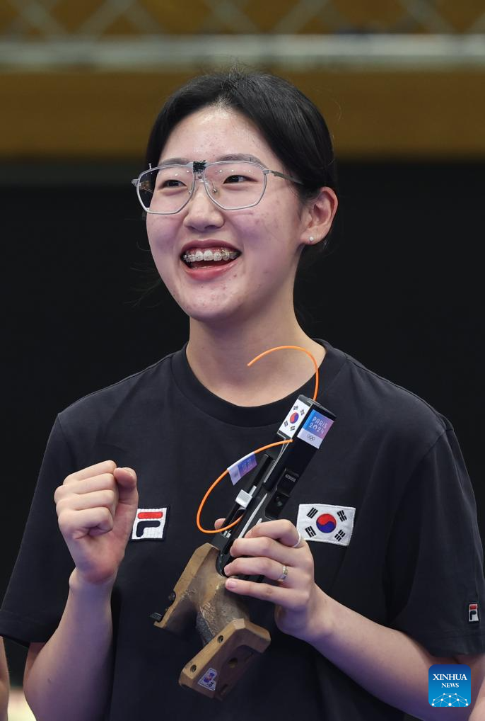 Yang Jiin of South Korea celebrates after the 25m pistol women's final of shooting at the Paris 2024 Olympic Games in Chateauroux, France, Aug. 3, 2024. (Xinhua/Zhao Dingzhe)