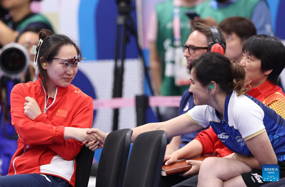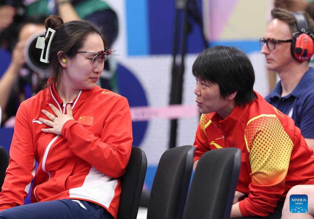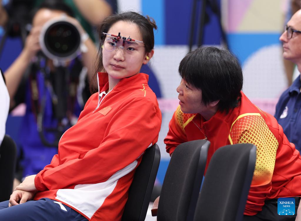 Zhao Nan (L) of China is seen during the 25m pistol women's final of shooting at the Paris 2024 Olympic Games in Chateauroux, France, Aug. 3, 2024. (Xinhua/Zhang Fan)