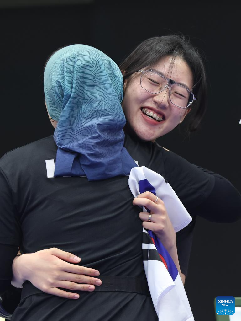 Yang Jiin (R) of South Korea celebrates after the 25m pistol women's final of shooting at the Paris 2024 Olympic Games in Chateauroux, France, Aug. 3, 2024. (Xinhua/Zhao Dingzhe)