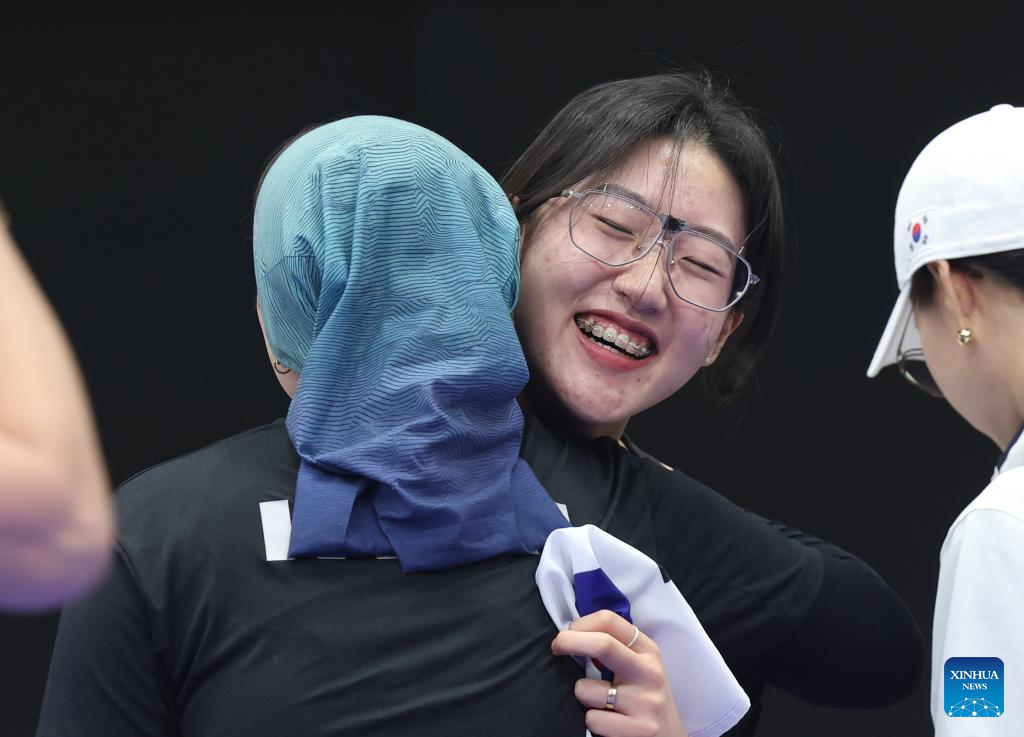 Yang Jiin (2nd L) of South Korea celebrates after the 25m pistol women's final of shooting at the Paris 2024 Olympic Games in Chateauroux, France, Aug. 3, 2024. (Xinhua/Zhao Dingzhe)