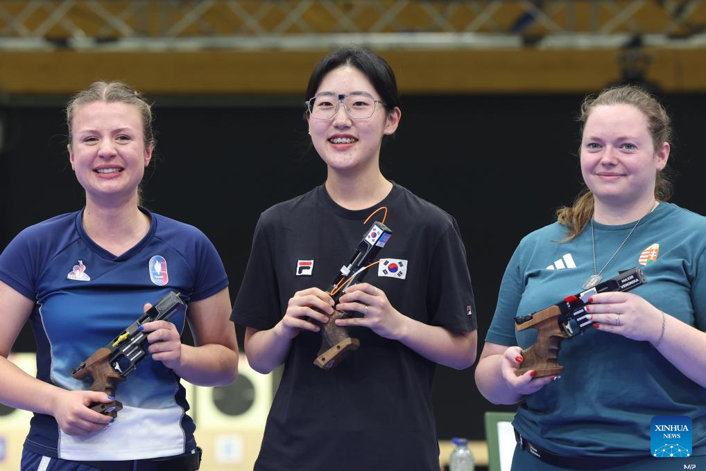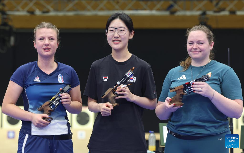 Yang Jiin of South Korea (C), Camille Jedrzejewski (L) of France and Veronika Major of Hungary pose for photos after the 25m pistol women's final of shooting at the Paris 2024 Olympic Games in Chateauroux, France, Aug. 3, 2024. (Xinhua/Zhao Dingzhe)