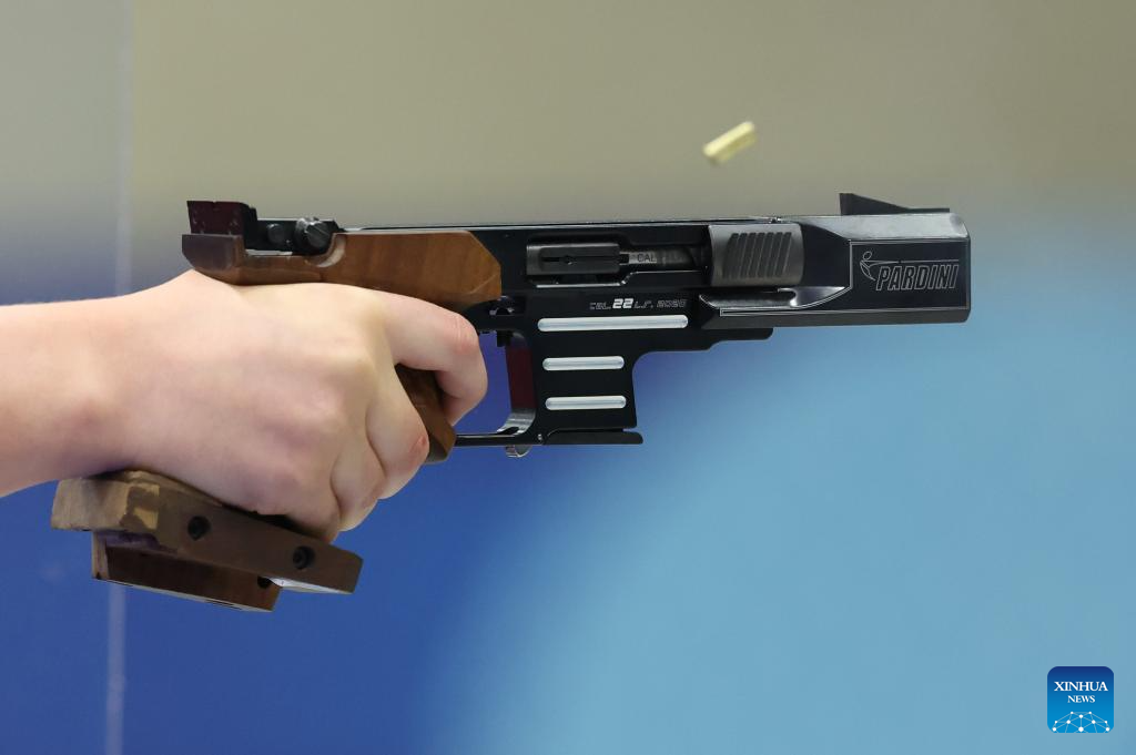 Camille Jedrzejewski of France competes during the 25m pistol women's final of shooting at the Paris 2024 Olympic Games in Chateauroux, France, Aug. 3, 2024. (Xinhua/Zhao Dingzhe)