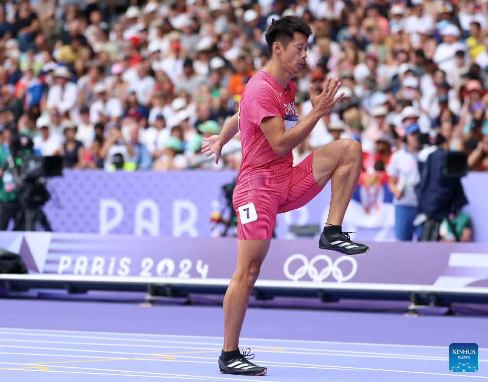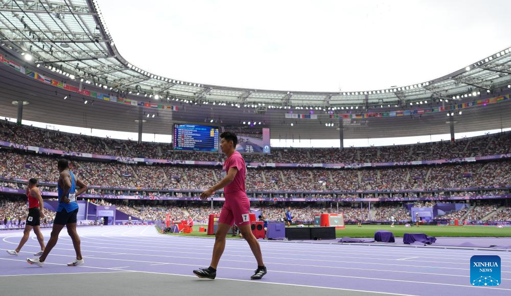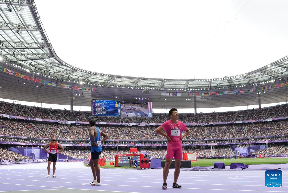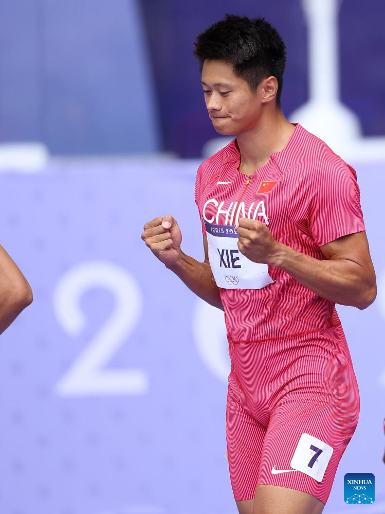 Xie Zhenye of China reacts after the men's 100m round 1 of Athletics at the Paris 2024 Olympic Games in Paris, France, Aug. 3, 2024. (Xinhua/Lui Siu Wai)
