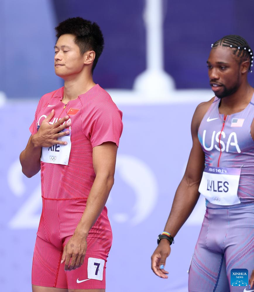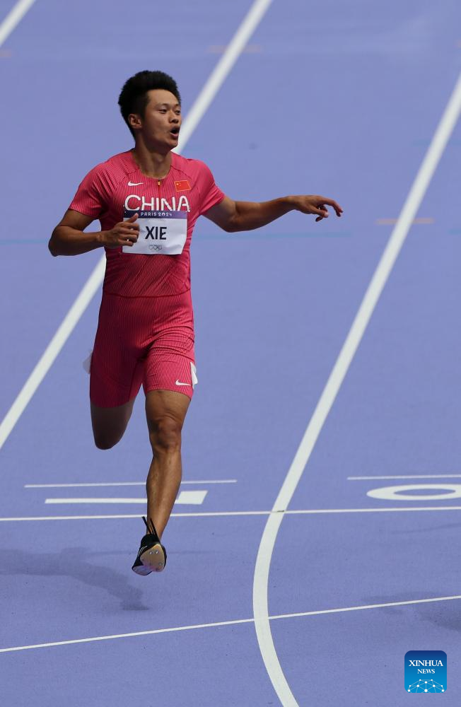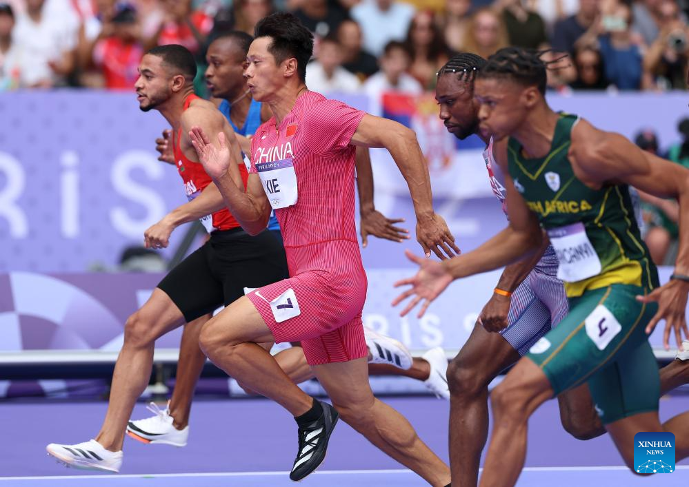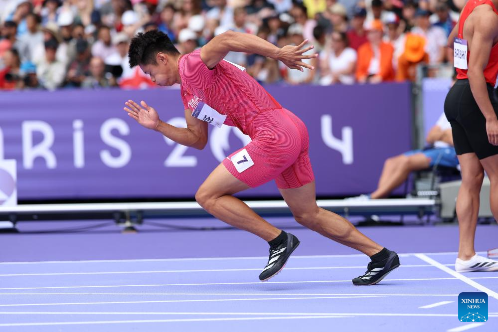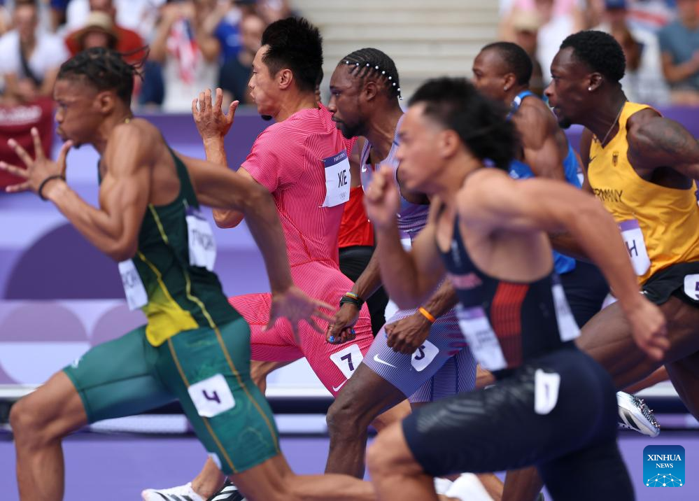 Xie Zhenye of China competes during the men's 100m round 1 of Athletics at the Paris 2024 Olympic Games in Paris, France, Aug. 3, 2024. (Xinhua/Li Gang)