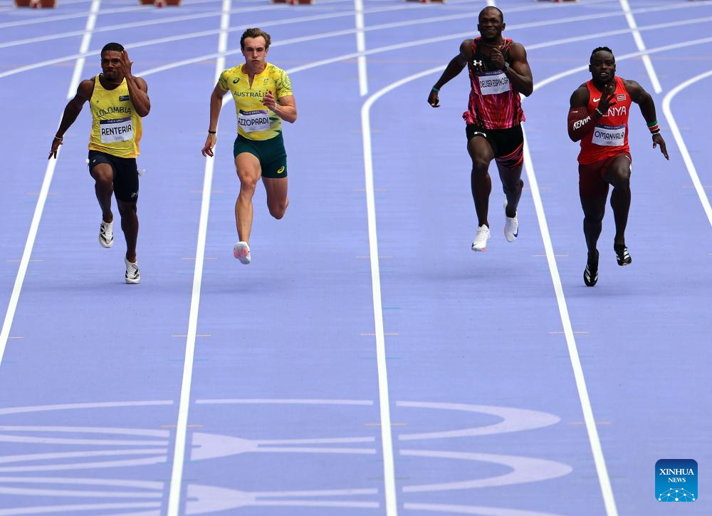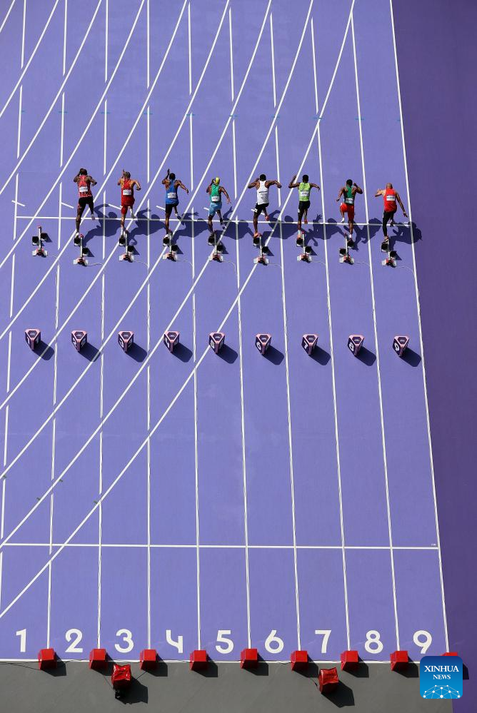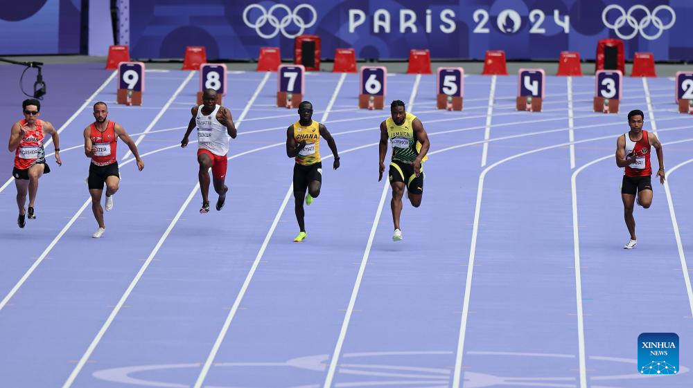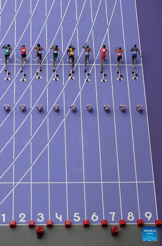 Athletes compete during the men's 100m preliminary round of Athletics at the Paris 2024 Olympic Games in Paris, France, Aug. 3, 2024. (Xinhua/Li Jing)
