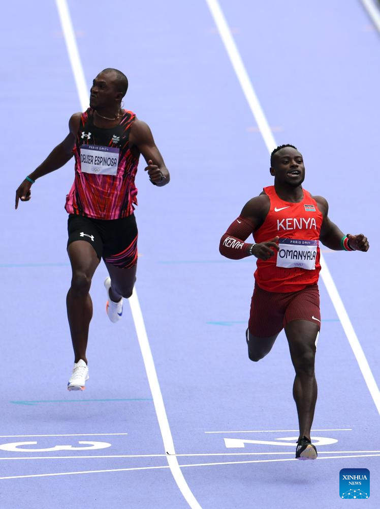 Ferdinand Omanyala (1st R) of Kenya competes during the men's 100m round 1 of Athletics at the Paris 2024 Olympic Games in Paris, France, Aug. 3, 2024. (Xinhua/Li Gang)