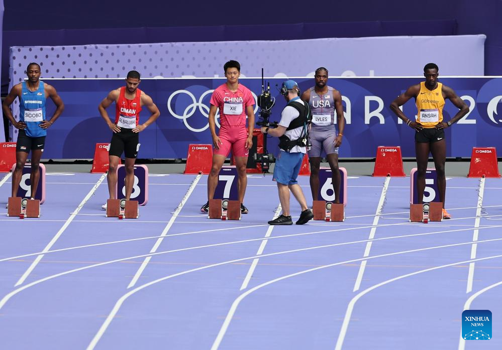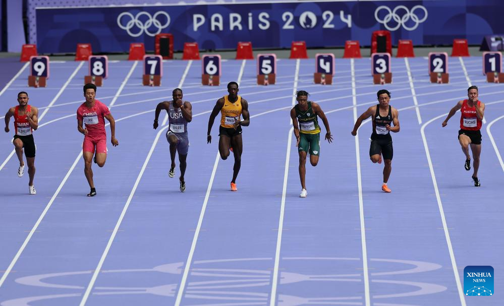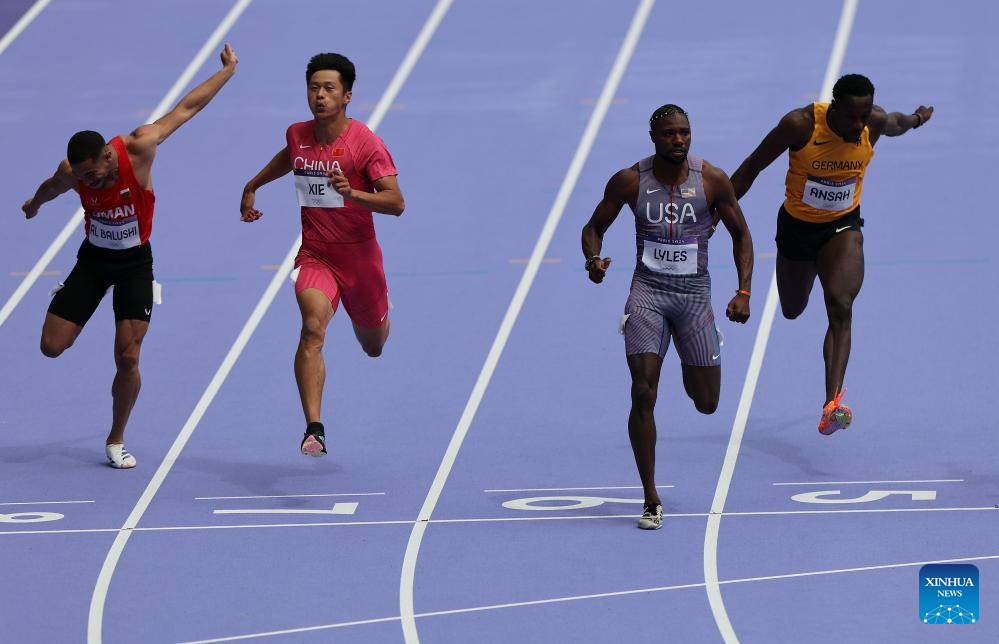 Xie Zhenye (C) of China and Noah Lyles (2nd R) of the United States compete during the men's 100m round 1 of Athletics at the Paris 2024 Olympic Games in Paris, France, Aug. 3, 2024. (Xinhua/Li Ming)