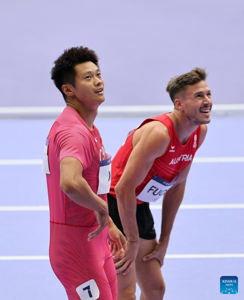 Xie Zhenye (R) of China reacts after the men's 100m round 1 of Athletics at the Paris 2024 Olympic Games in Paris, France, Aug. 3, 2024. (Xinhua/Lui Siu Wai)