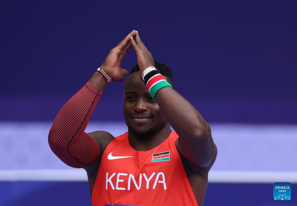 Ferdinand Omanyala of Kenya reacts before the men's 100m round 1 of Athletics at the Paris 2024 Olympic Games in Paris, France, Aug. 3, 2024. (Xinhua/Li Ming)