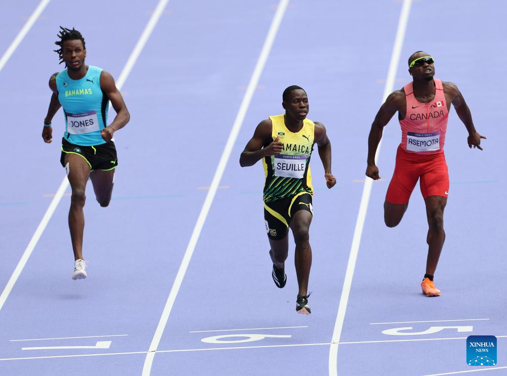 Oblique Seville (C) of Jamaica competes during the men's 100m round 1 of Athletics at the Paris 2024 Olympic Games in Paris, France, Aug. 3, 2024. (Xinhua/Li Gang)