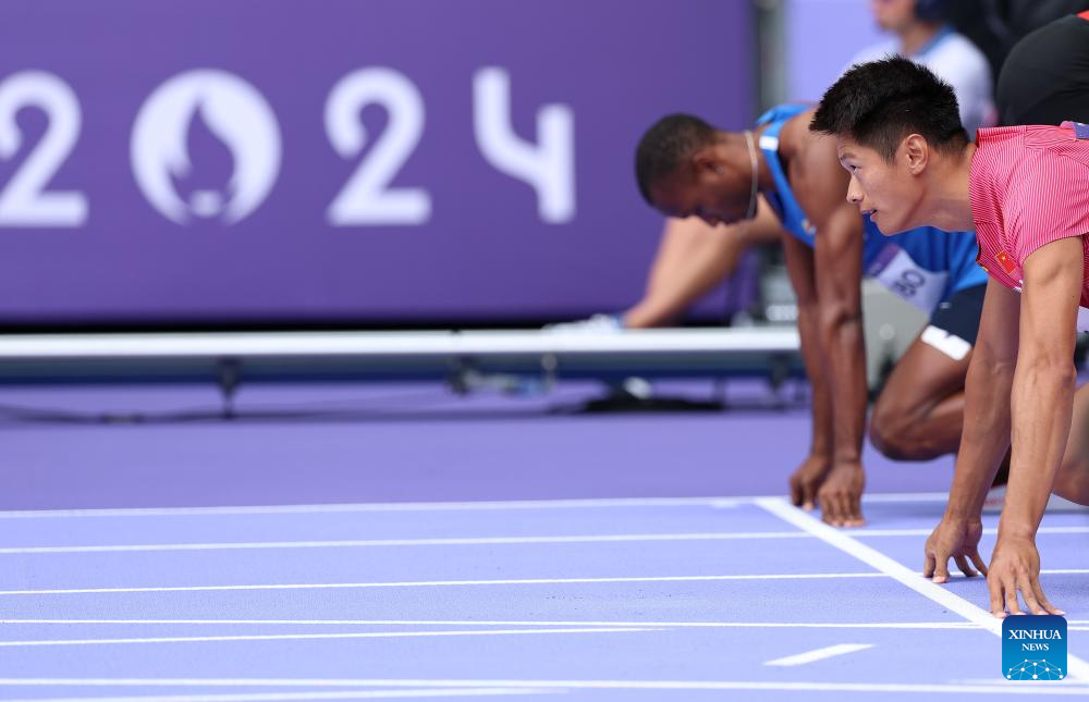 Xie Zhenye of China prepares for the men's 100m round 1 of Athletics at the Paris 2024 Olympic Games in Paris, France, Aug. 3, 2024. (Xinhua/Li Ming)