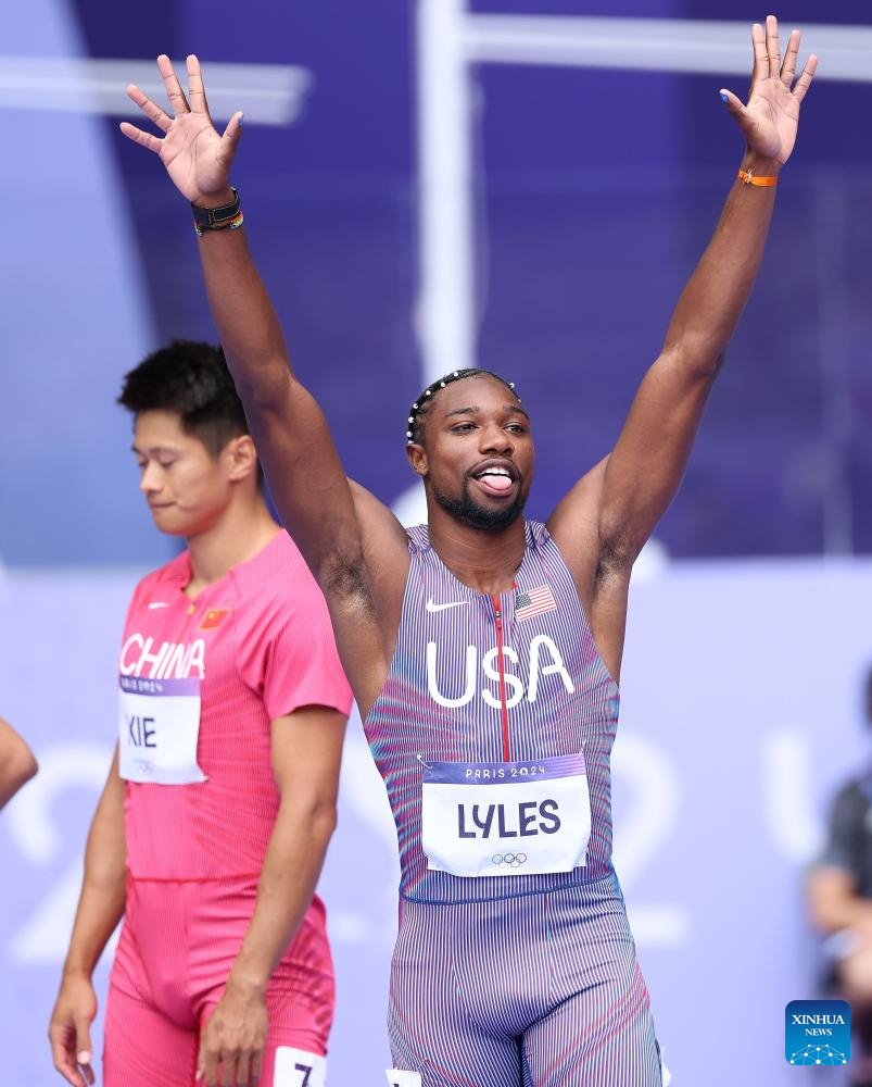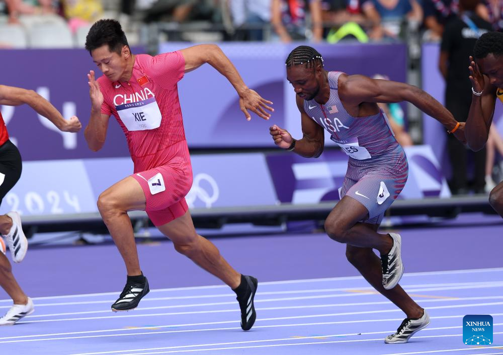 Xie Zhenye (L) of China and Noah Lyles of the United States compete during the men's 100m round 1 of Athletics at the Paris 2024 Olympic Games in Paris, France, Aug. 3, 2024. (Xinhua/Li Ming)