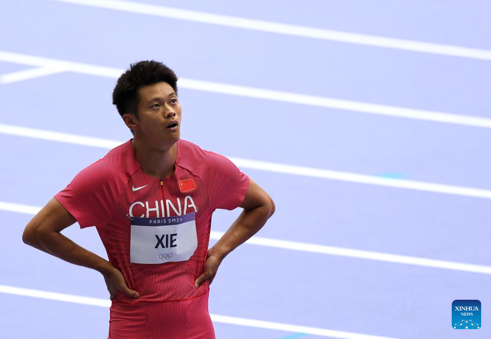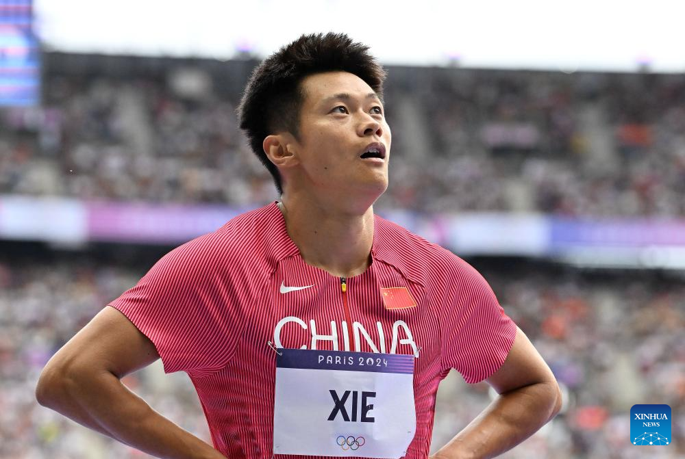 Xie Zhenye of China reacts after the men's 100m round 1 of Athletics at the Paris 2024 Olympic Games in Paris, France, Aug. 3, 2024. (Xinhua/Li Gang)