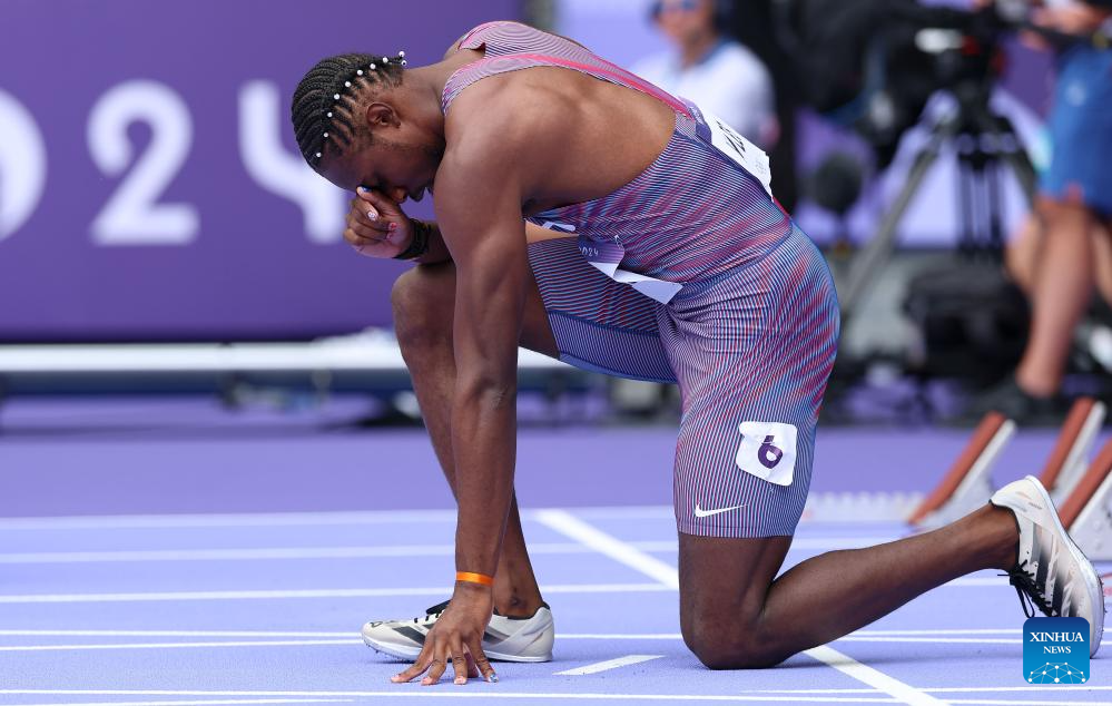 Noah Lyles of the United States reacts before the men's 100m round 1 of Athletics at the Paris 2024 Olympic Games in Paris, France, Aug. 3, 2024. (Xinhua/Li Ming)