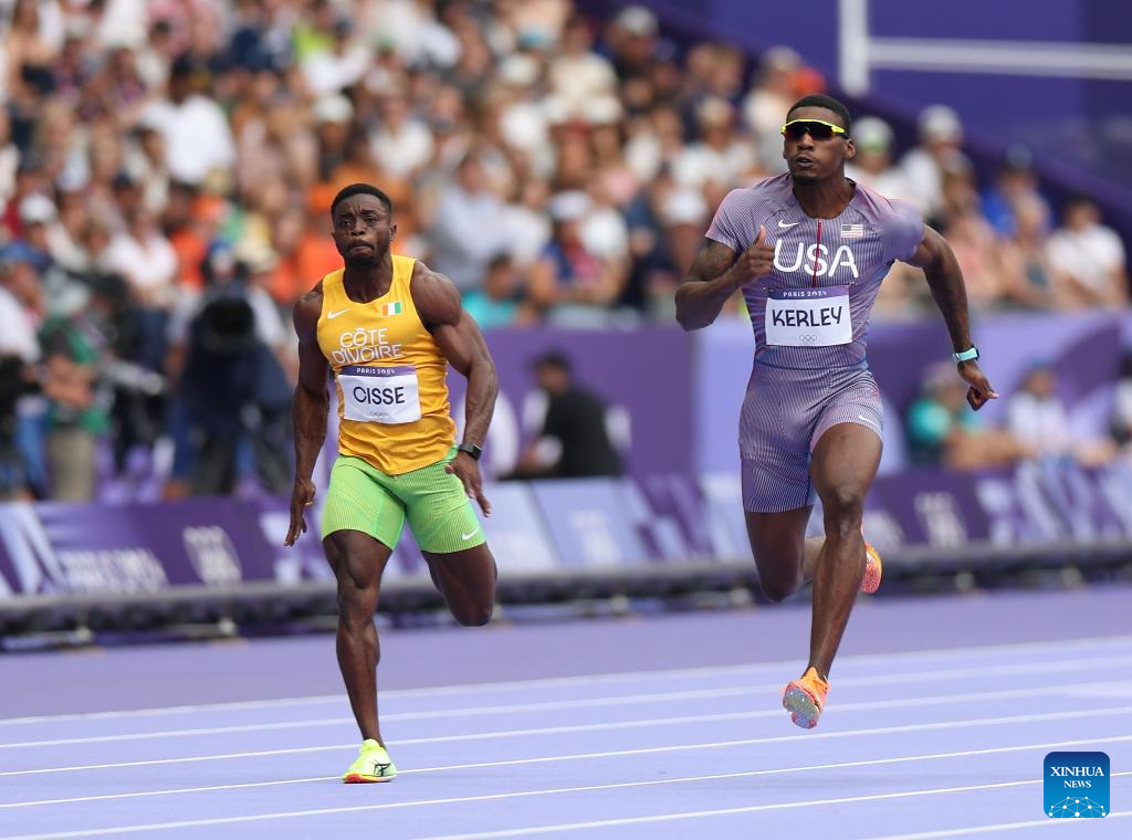 Fred Kerley (R) of the United States compete during the men's 100m round 1 of Athletics at the Paris 2024 Olympic Games in Paris, France, Aug. 3, 2024. (Xinhua/Li Ying)