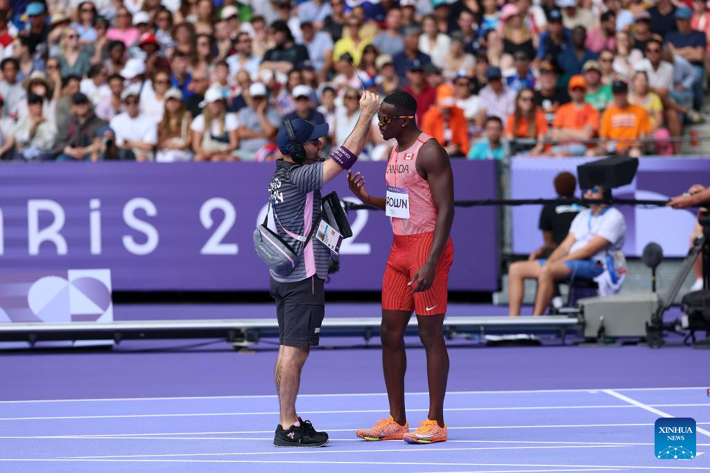 Aaron Brown (R) of Canada is disqualified for a false start at the men's 100m round 1 of Athletics at the Paris 2024 Olympic Games in Paris, France, Aug. 3, 2024. (Xinhua/Li Ming)