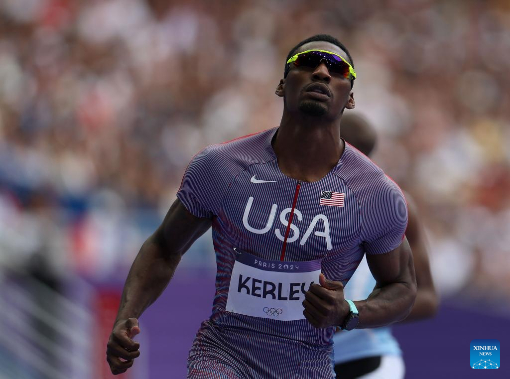 Fred Kerley of the United States competes during the men's 100m round 1 of Athletics at the Paris 2024 Olympic Games in Paris, France, Aug. 3, 2024. (Xinhua/Li Ying)