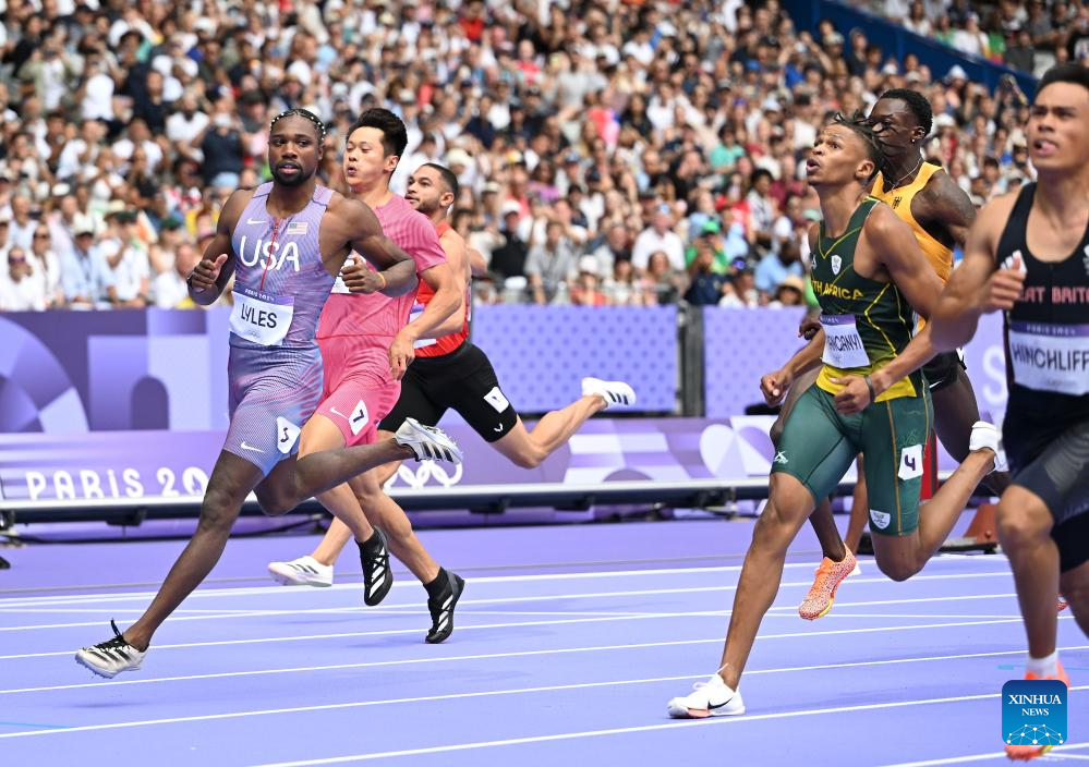 Xie Zhenye (2nd L) of China and Noah Lyles (2nd R) of the United States compete during the men's 100m round 1 of Athletics at the Paris 2024 Olympic Games in Paris, France, Aug. 3, 2024. (Xinhua/Li Gang)