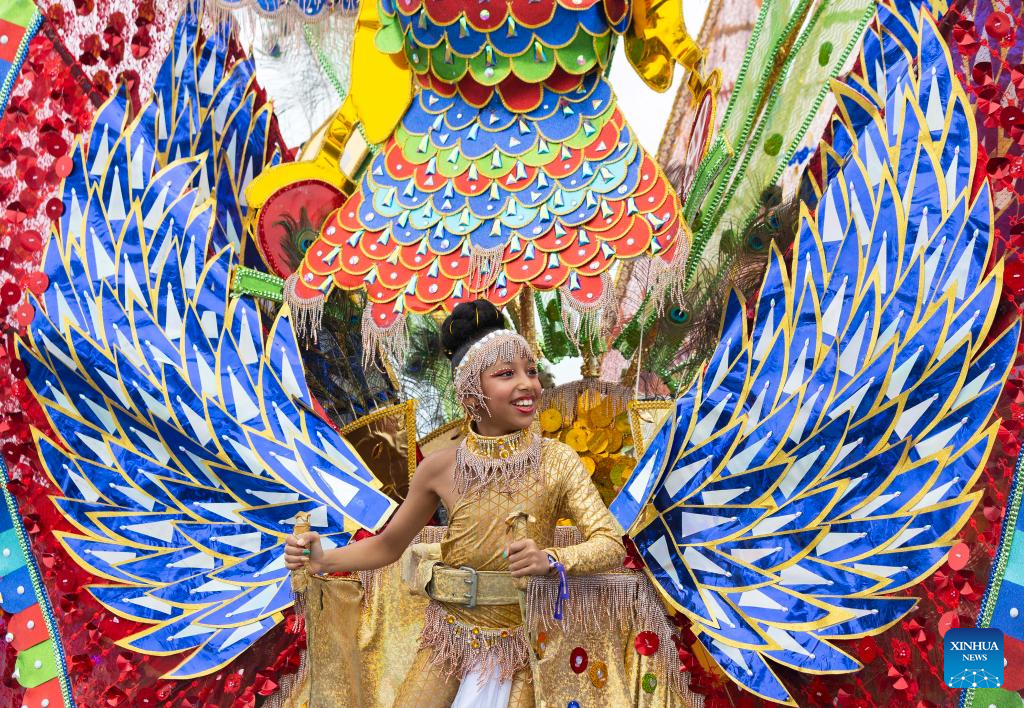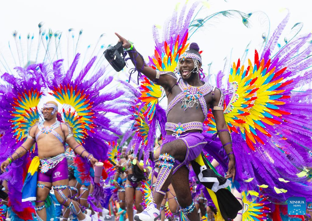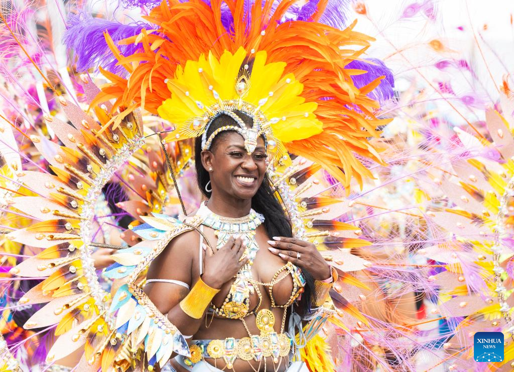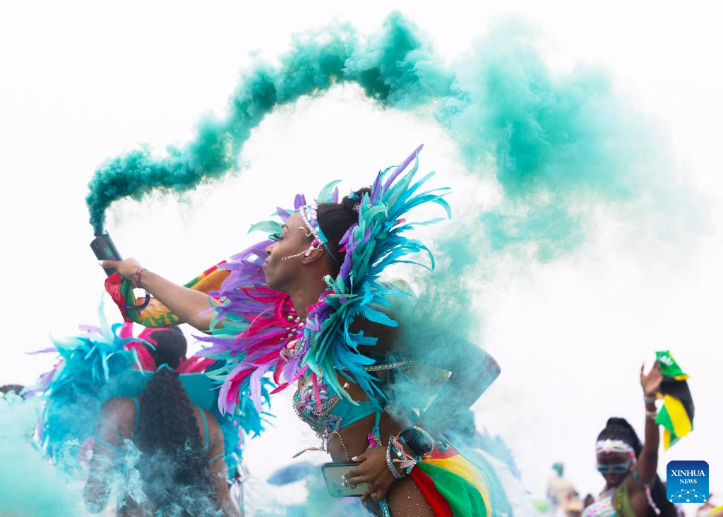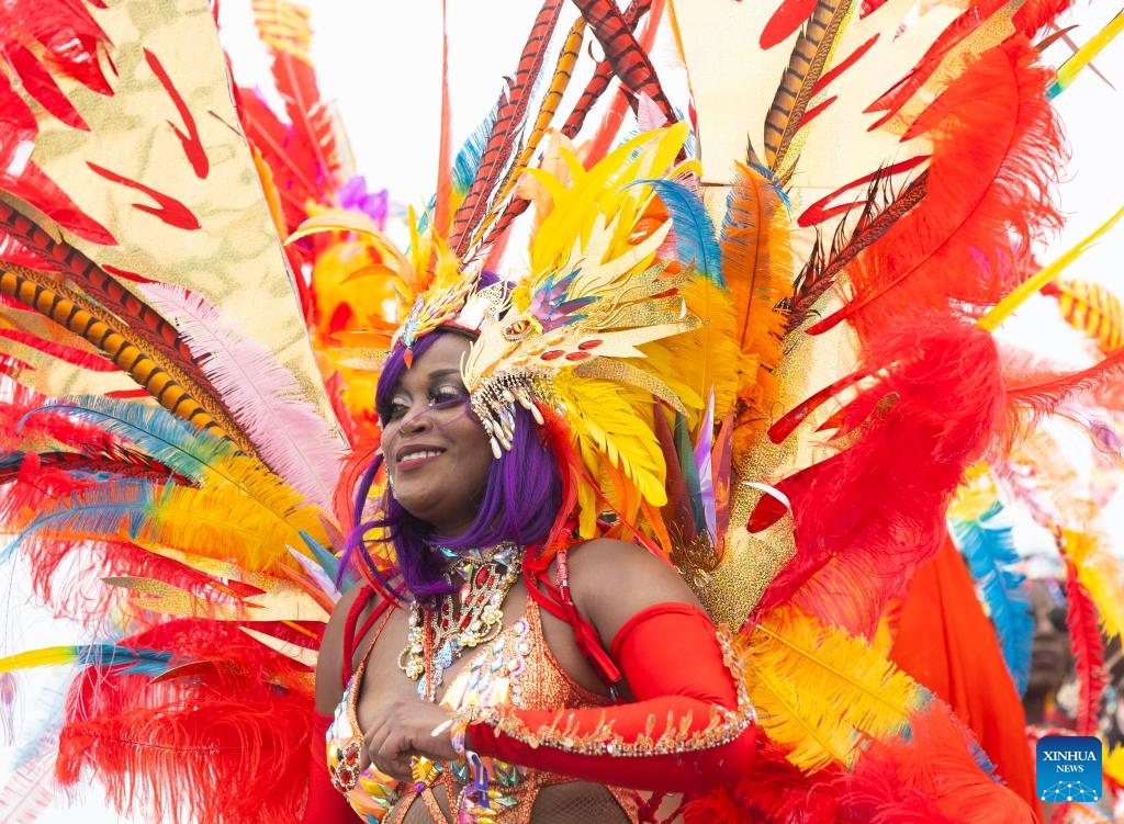 A dressed-up reveler takes part in the Grand Parade of the 2024 Toronto Caribbean Carnival in Toronto, Canada, Aug. 3, 2024.
