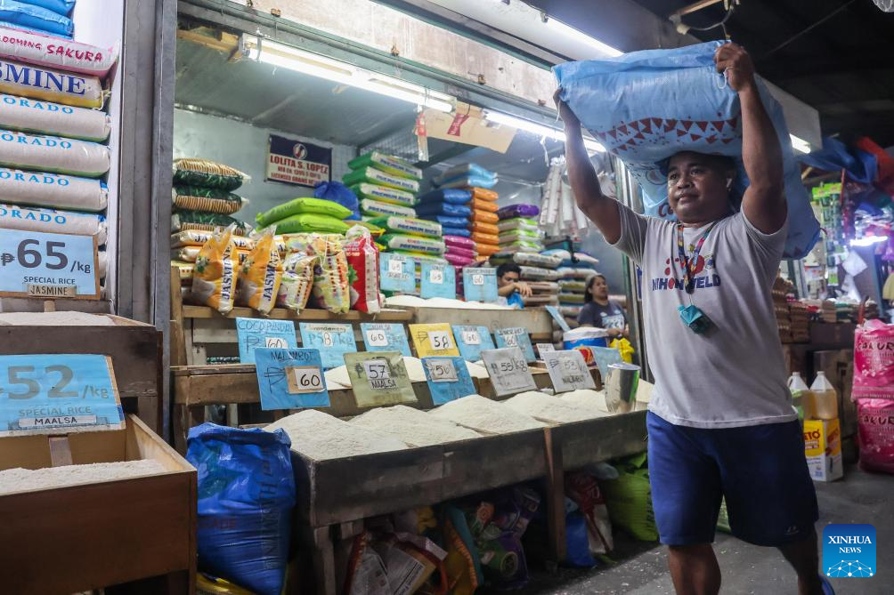 A man carries a sack of rice at a market in Quezon City, the Philippines, Aug. 6, 2024. The Philippines' headline inflation in July has reached its highest rate so far this year, accelerating to 4.4 percent in July from 3.7 percent in June, the Philippine Statistics Authority (PSA) said Tuesday. (Xinhua/Rouelle Umali)