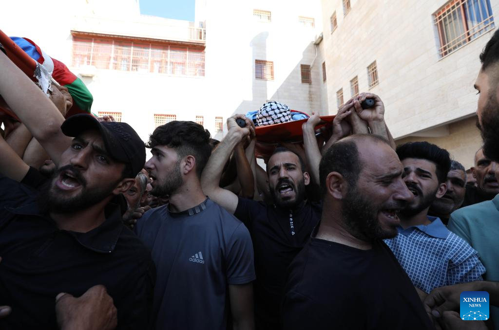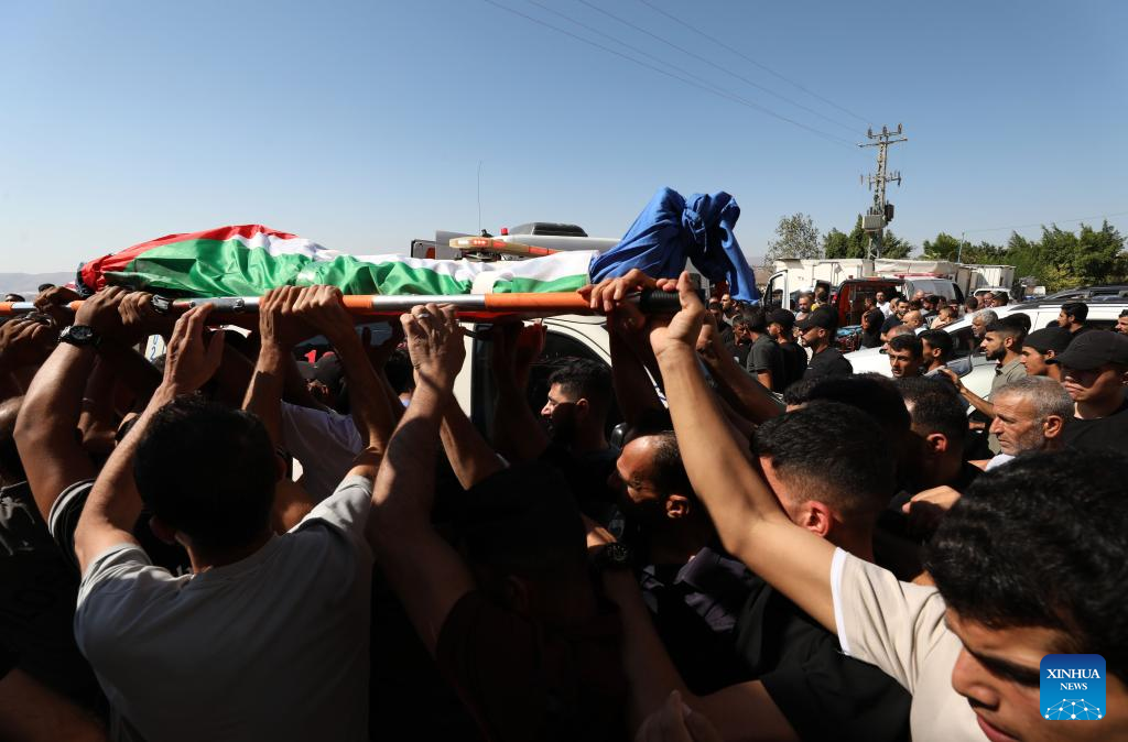 People carry bodies of victims killed in an Israeli raid during a funeral in the West Bank city of Tubas, on Aug. 6, 2024. Four Palestinians were killed and seven others injured by Israeli forces near the northern West Bank city of Tubas on Monday evening, the Palestinian Health Ministry said on Tuesday. (Photo by Ayman Nobani/Xinhua)