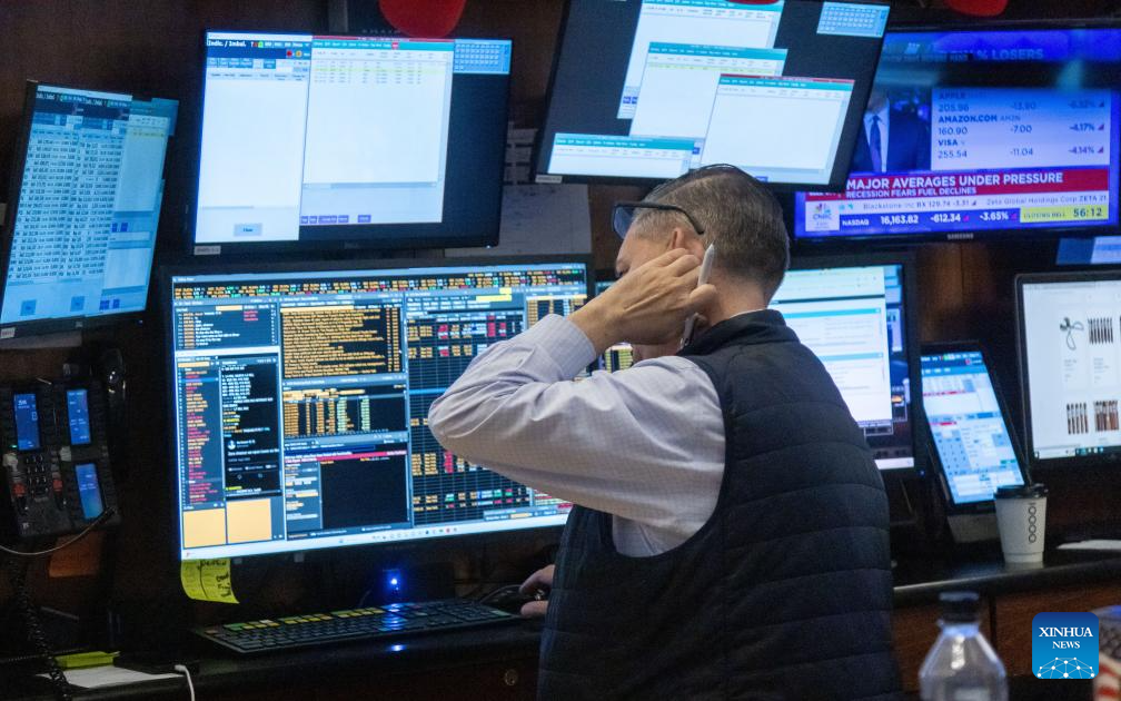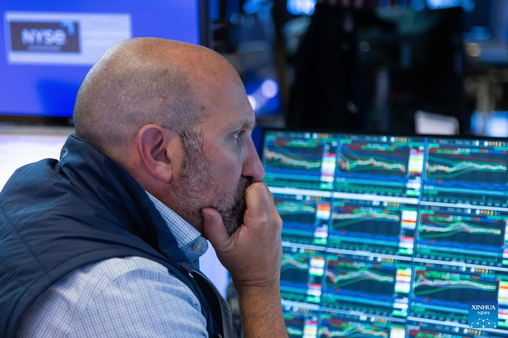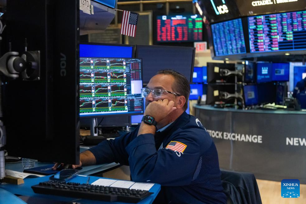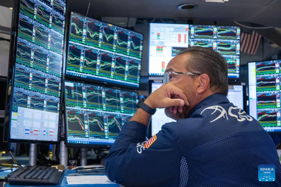 A trader works on the trading floor of the New York Stock Exchange (NYSE) in New York, the United States, on Aug. 5, 2024. U.S. stocks ended sharply lower on Monday. The Dow Jones Industrial Average fell by 1,033.99 points, or 2.60 percent, to 38,703.27. The S&P 500 sank 160.23 points, or 3.00 percent, to 5,186.33. The Nasdaq Composite Index shed 576.08 points, or 3.43 percent, to 16,200.08. (Photo by Michael Nagle/Xinhua)