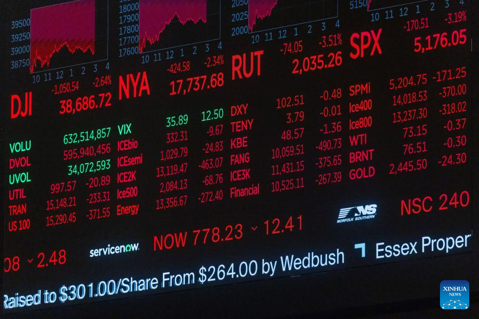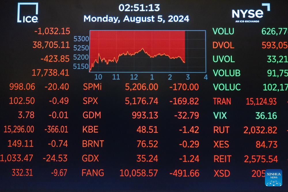 A monitor displays stock market information on the trading floor of the New York Stock Exchange (NYSE) in New York, the United States, on Aug. 5, 2024. U.S. stocks ended sharply lower on Monday. The Dow Jones Industrial Average fell by 1,033.99 points, or 2.60 percent, to 38,703.27. The S&P 500 sank 160.23 points, or 3.00 percent, to 5,186.33. The Nasdaq Composite Index shed 576.08 points, or 3.43 percent, to 16,200.08. (Photo by Michael Nagle/Xinhua)