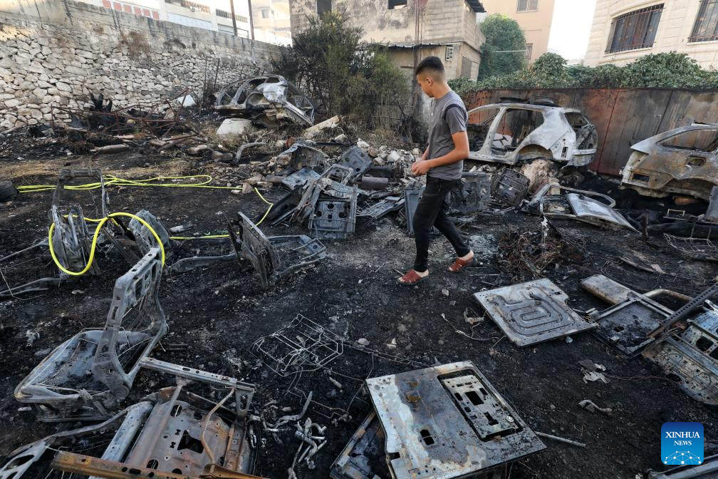 A man walks past vehicles burned during clashes between Palestinian protesters and Israeli settlers in the West Bank city of Nablus, on Aug. 5, 2024. (Photo by Nidal Eshtayeh/Xinhua)