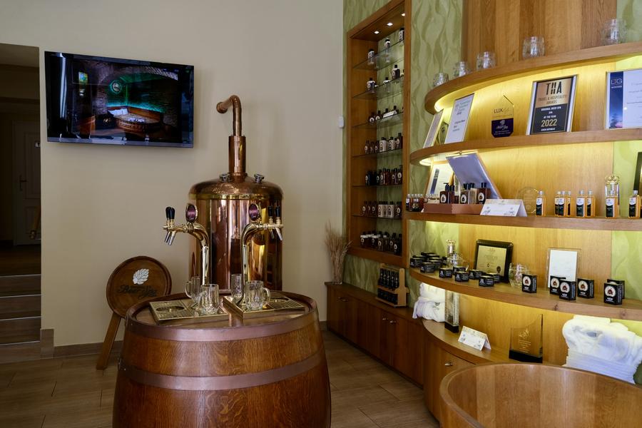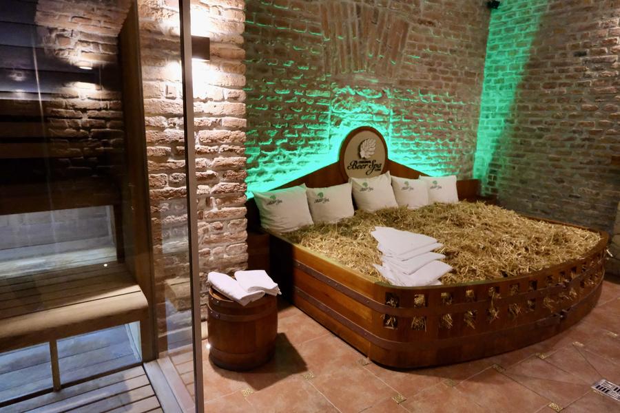 While bathing, guests can enjoy the ambiance with music and relish light and dark beer directly from handy taps. They can then relax on a wheat hay bed, allowing their bodies to fully absorb the vitamins and extracts from the bath.