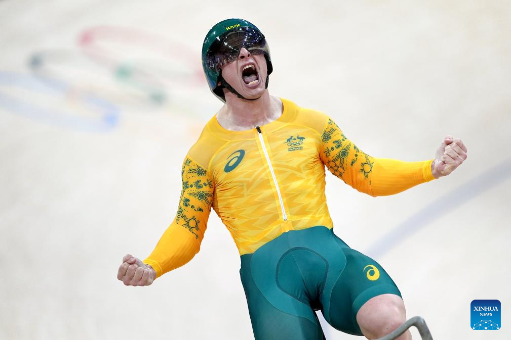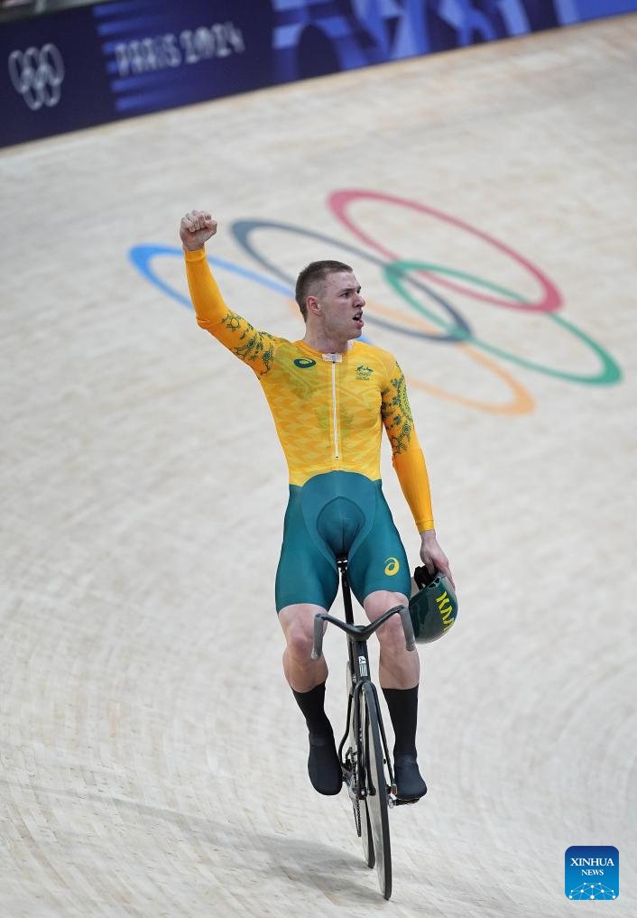 Leigh Hoffman of Australia celebrates after winning the cycling track men's team sprint finals for bronze at the Paris 2024 Olympic Games in Paris, France, Aug. 6, 2024. (Xinhua/Li Yibo)