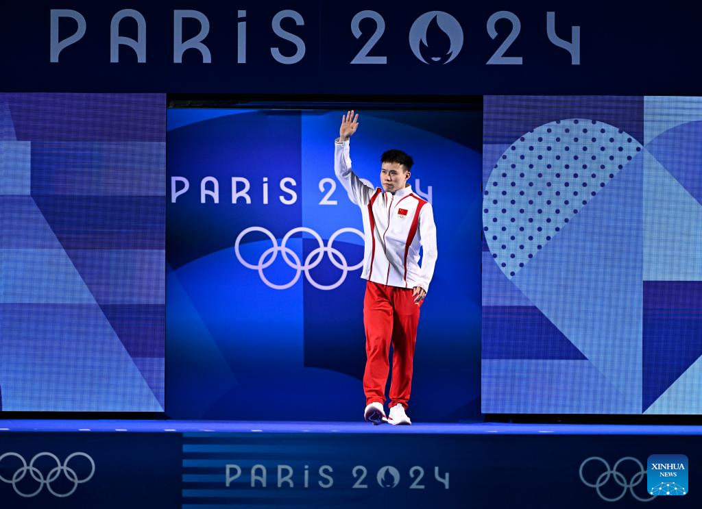 Xie Siyi of China waves prior to the men's 3m springboard semifinal of diving at the Paris 2024 Olympic Games in Saint-Denis, France, Aug. 7, 2024. (Xinhua/Wang Peng)