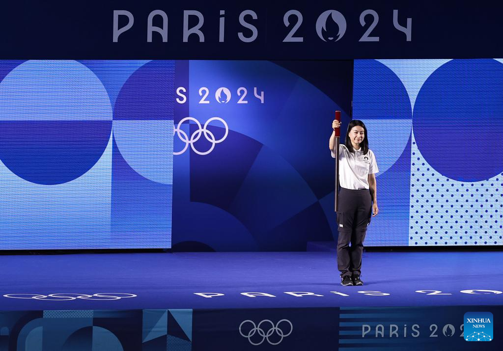 Referee Guo Jingjing reacts before the men's 3m springboard semifinal of diving at the Paris 2024 Olympic Games in Saint-Denis, France, Aug. 7, 2024. (Xinhua/Zhang Yuwei)